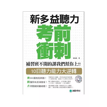 《新多益聽力考前衝刺》蒐集彙整了以往多益試題 90%以上必考的字彙、題型結構、混淆發音辨別,歸納出關鍵解題規則,一旦掌握住答題規則,考生聽到什麼樣的句子、對話或文章就能更熟悉題目要考的都是這些結構,馬上想到練習過的解題概念,聽完問題3秒鐘之後就能判斷出答案。本書很有系統地將試題中所有會聽到的題目與選項做結構分析,整理出一系列相同結構的選項句型,和一系列相同問法的問題,並將關鍵字彙標明出來,讓讀者透過關鍵字就可以判斷出答案。同時還將發音相似的單字句子做比較,避開陷阱選項。