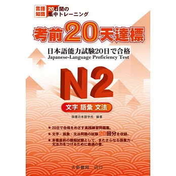 「考前20天達標」的要旨為加強新日本語能力試驗N2的語言知識科目。書中共收錄20回文字.語彙.文法模擬試題,每回皆有漢字讀音、轉換類義說法、詞語形成,及判斷文法形式等豐富內容,學習者可於正式考前20天,一天一回集中練習,增強語彙能力及文法能力,邁向合格之路。