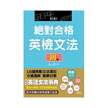 「全民英檢」是由教育部補助,財團法人訓練測驗中心研發而成的一套檢測英語能力的分級檢定系統,整套分初、中、中高、高、優等五個級數。其中,初級相當於國中畢業程度,也就是要具有基礎英語能力,能理解和使用簡單的日常用語。《絕對合格英檢文法初級》就是為了參加英檢考試的考生,編寫的一本文法書。特色有: