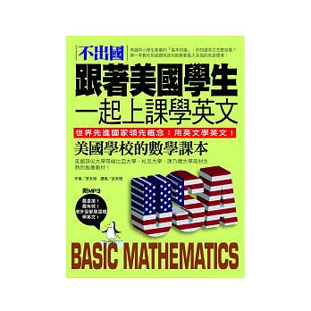 除了美國人常用單字最完整收錄,這本書還獨家收錄數學科內容,讓讀者有機會和美國學生一起上數學課!每個單元都有重點提要,獨家搭配中文版對照,立即全面掌握加減乘除、分數唸法、時間判讀、幾何圖形(如三角形、正方形、長方形等)、百分比等必備數學常識。這些常常出現在GRE、SAT、TOEFL考試中出現的字眼,只有這本書有完整收錄,用老外的方法學英文,才是最有效、最正確的正統用法!