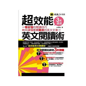 其實學好英文閱讀真的比背單字和學文法還輕鬆、簡單。只要掌握《超效能英文閱讀術》中所提示的閱讀技巧,保証讓你讀英文就像讀中文一樣順暢、自然。